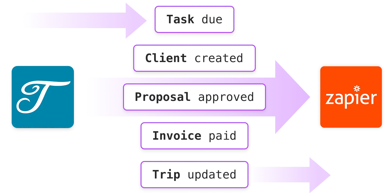 For an additional $29/month, you can add the TravelJoy Zapier integration to your Pro account and access our custom triggers and actions. Add Zapier to your plan →